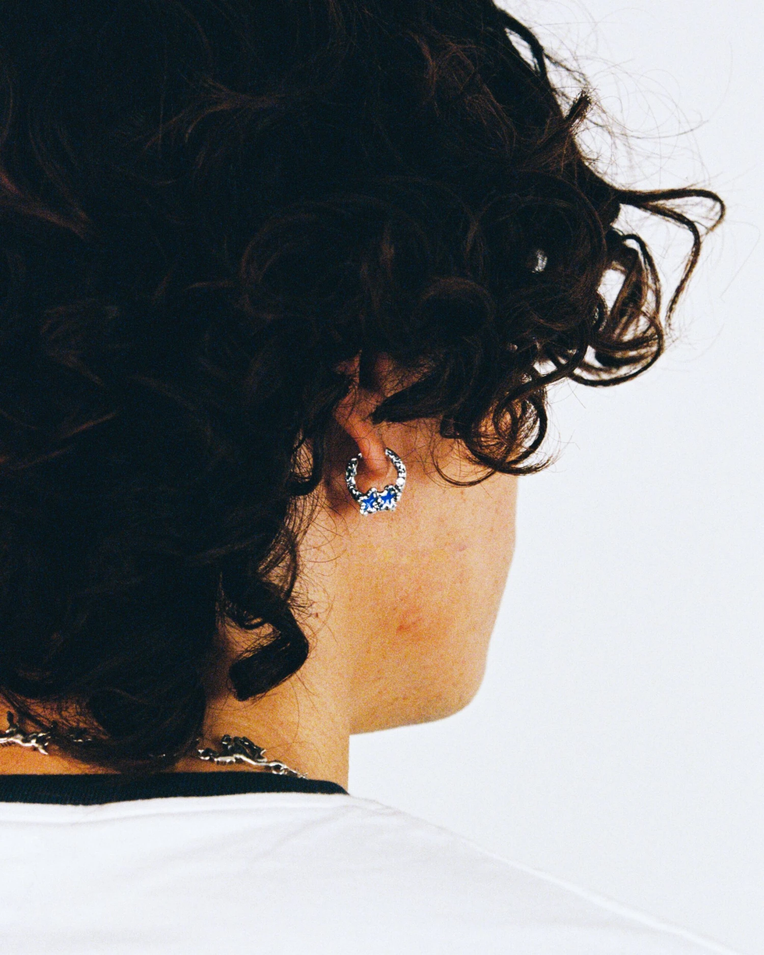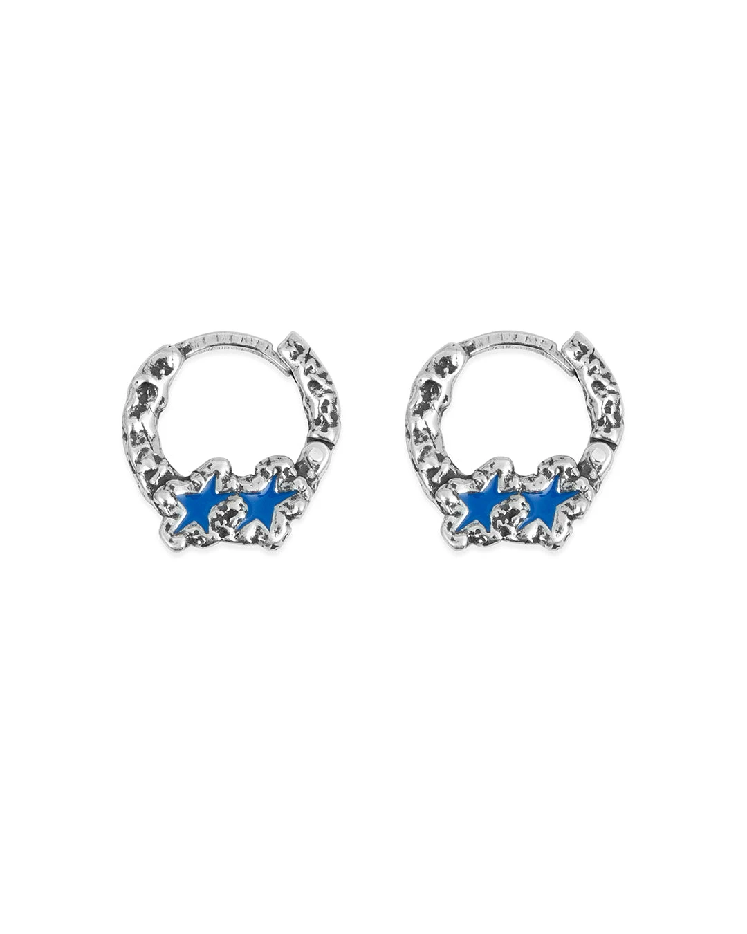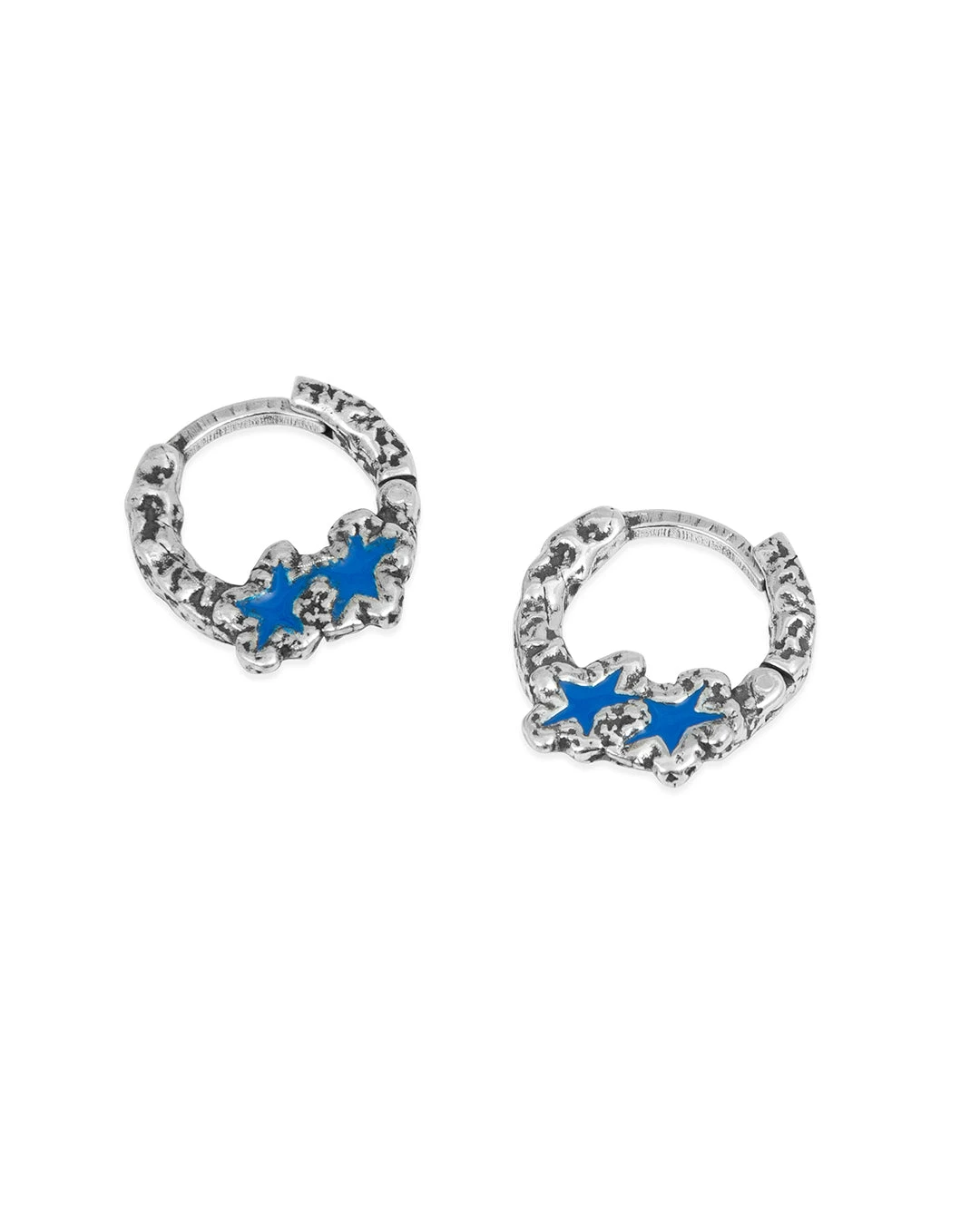 925 sterling silver earring. Bright polished with contrasting oxidized finish and enameled icons. Hinge closure. Comes in a pair.
