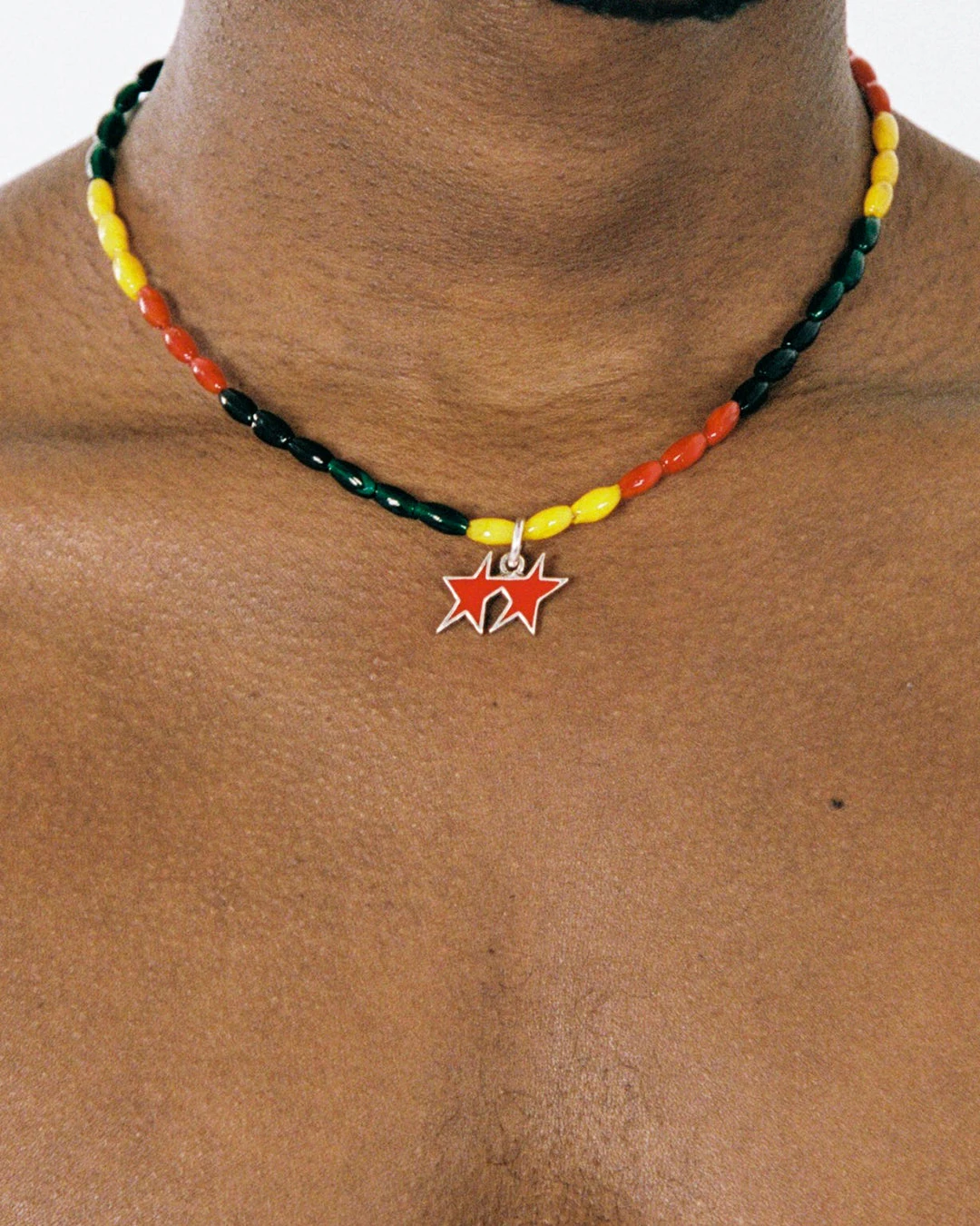 The Jamaican Necklace is made of natural blue stained-glass beads, with the icon logo charm bathed in silver and red enamel.