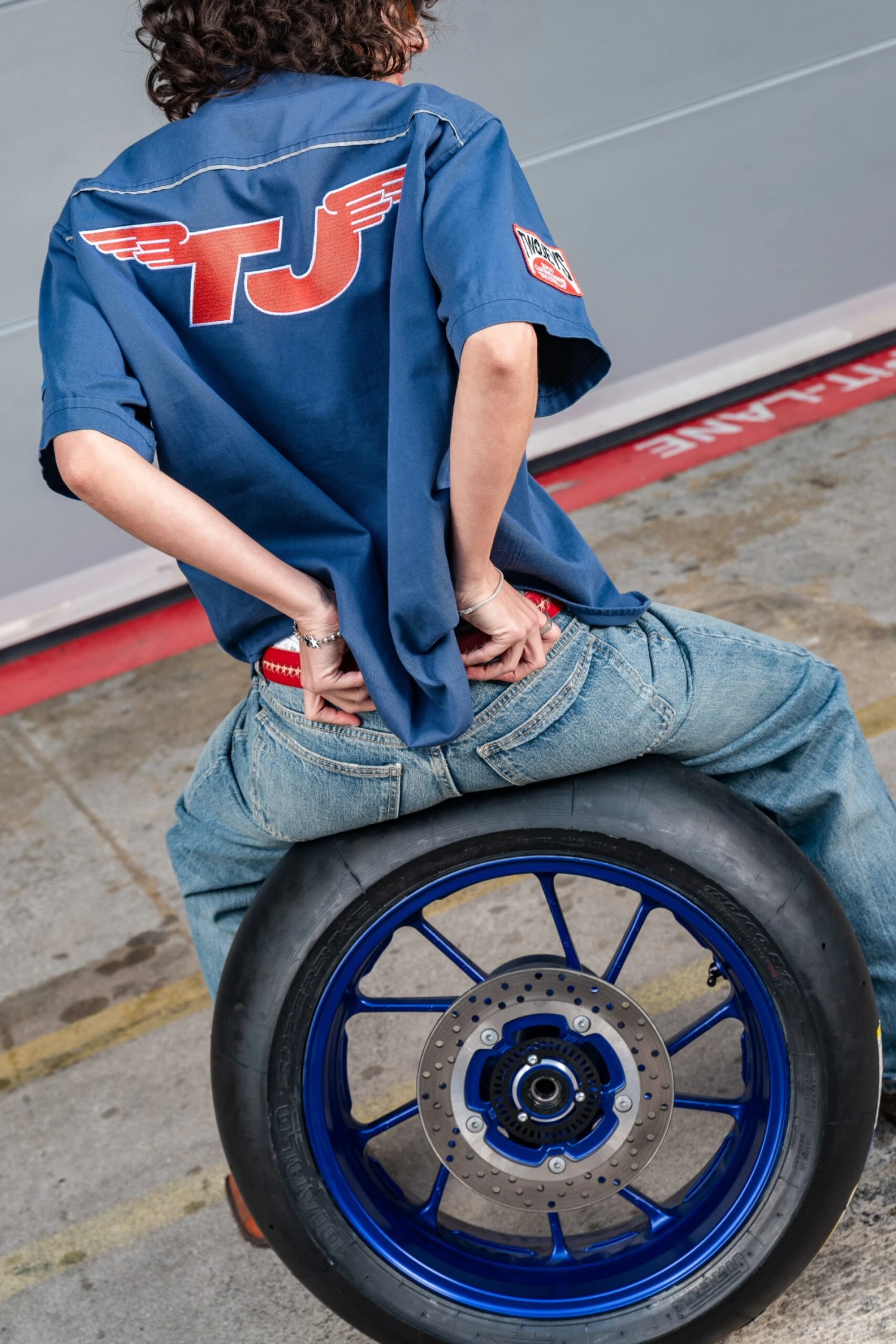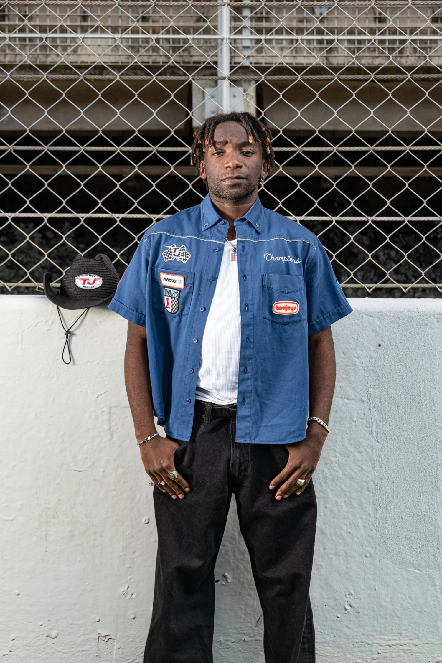 Heavy weight Twojeys custom shirt, is a mechanic shirt that features some embroidered patches on the chest and back.