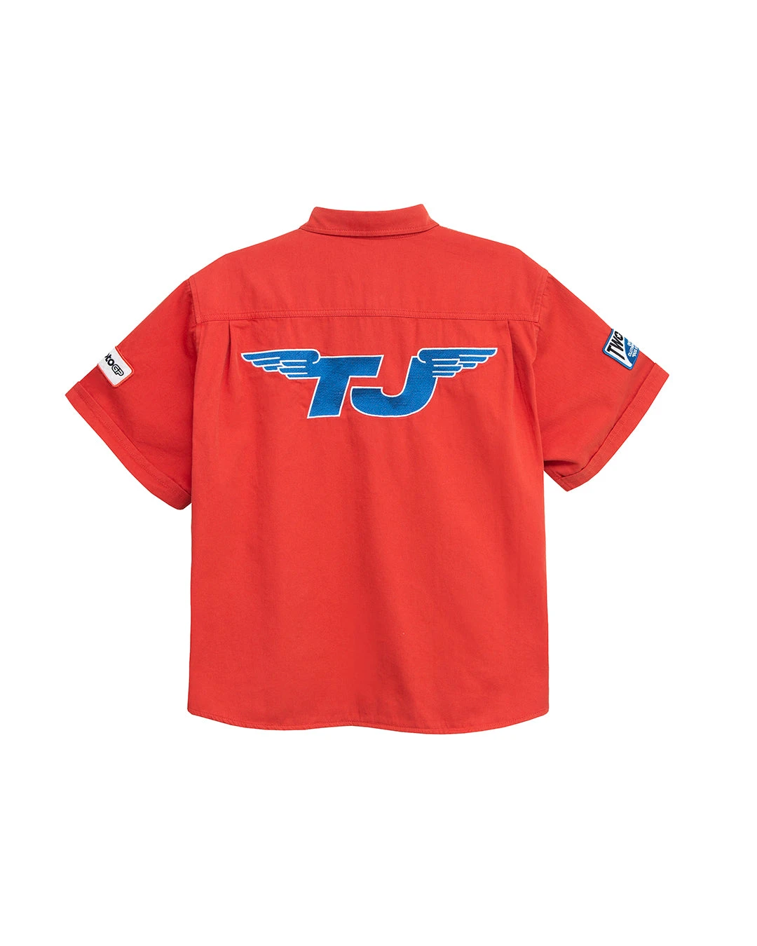 Heavy weight Twojeys custom shirt, is a mechanic shirt that features some embroidered patches on the chest and back.
