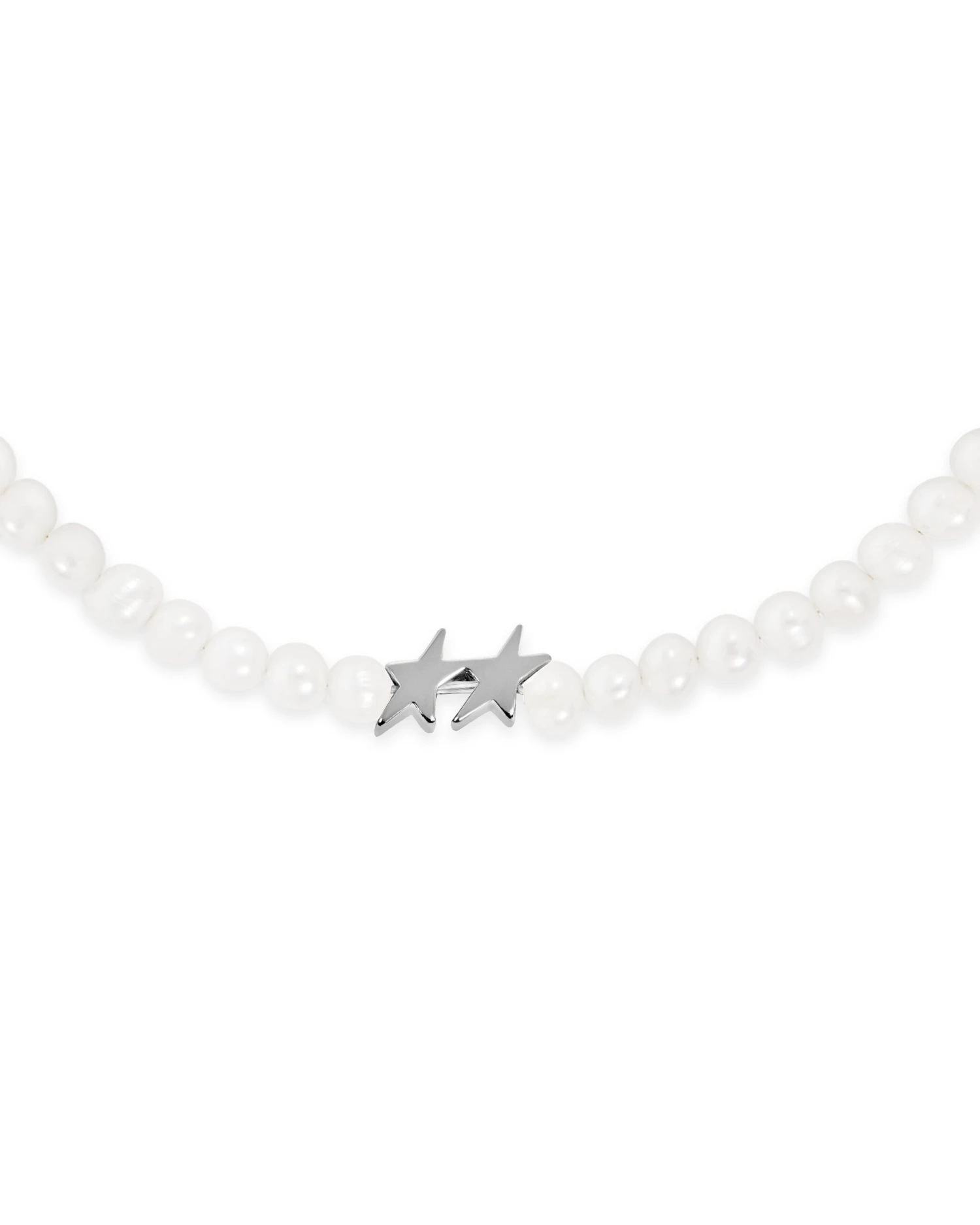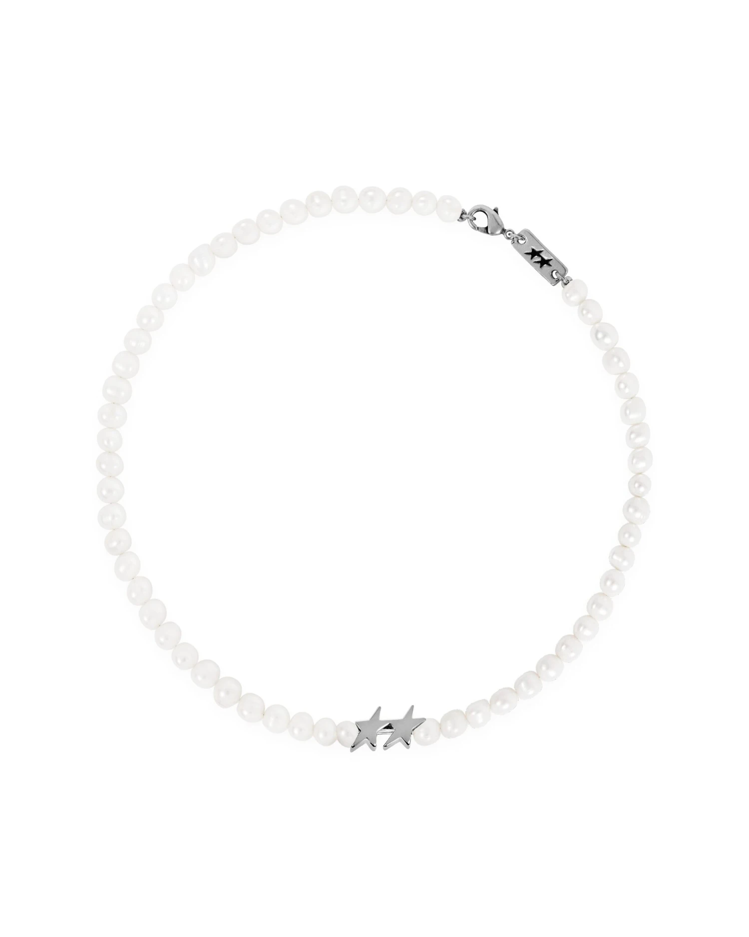 The TwoJeys Signature Pearl Necklace features white pearls and the icon logo plated in silver. The necklace clasps together with a lobster clasp that also details a high quality silver plate with the icon logo.
