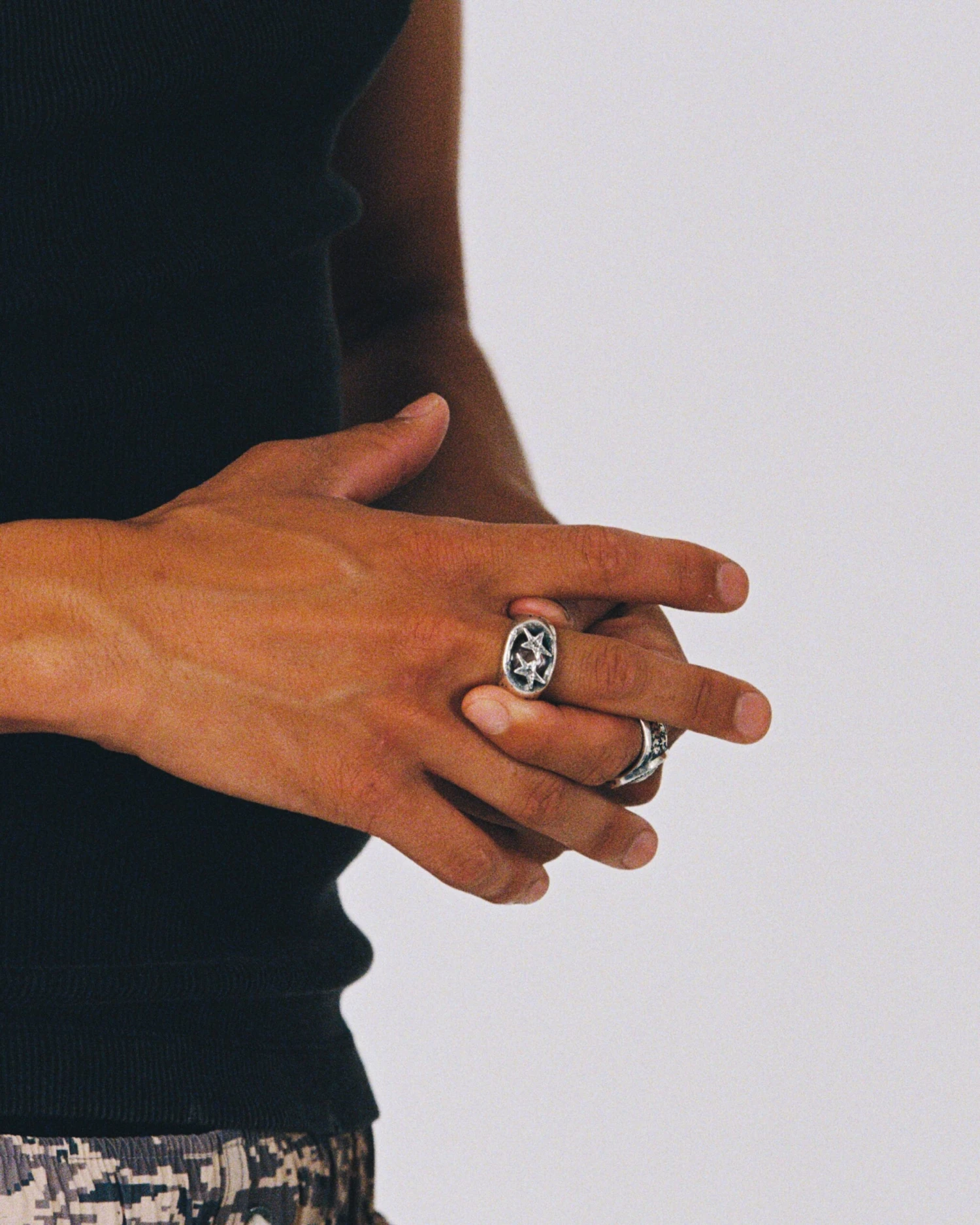 925 sterling silver ring. Bright polished, contrasting oxidized finish with stone set.